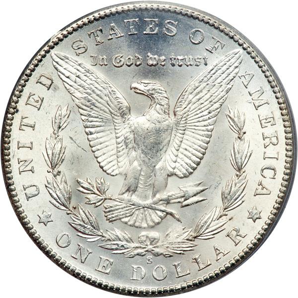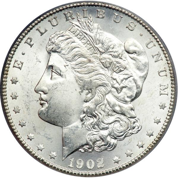 1902-S Morgan Dollar. PCGS graded MS-65. Frosty white coin. In the same rarity class as the 1901-S, the 1902-S is a challenging date to find in the present grade level. Careful preservation show from every surface. Both sides of this coin display the white satin sheen that typifies most survivors of this '02-S delivery, but this specimen advances that a few notches by being free of the typical bag and rollermarks seen on others. Well struck in all areas save for a few of the hair strands over Liberty's ear. A gem!Pop 264; 33 finer, 29 in 66, 4 in 67 (PCGS # 7282) .