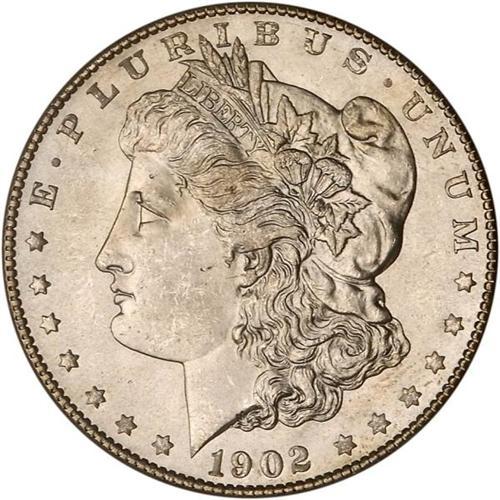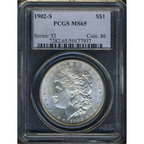 <b>1902-S Morgan Dollar. PCGS graded MS65.</b> Satin surfaces distributing the silver iridescence hither and yon in classic "cartwheel" fashion. The breast feathers are weak, as is the hair directly above the ear, but all other details are strong. This is an impressive Gem example of how a scarce late San Francisco mint Morgan Dollar can be preserved <b>(PCGS # 7282)</b>
