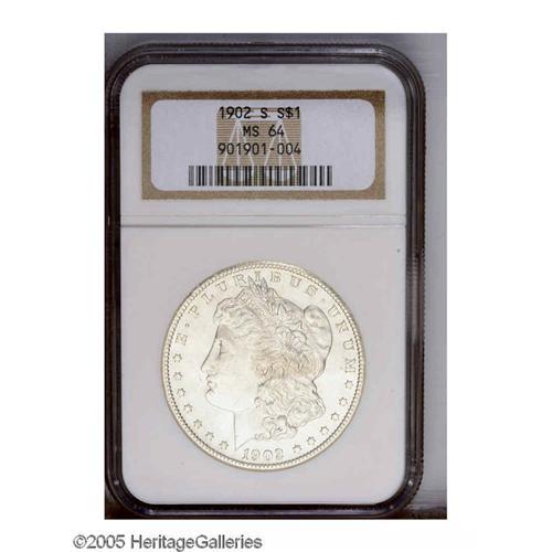1902-S S$1 MS64 NGC. A bright, satiny, silver-gray exa 1902-S[S$1] MS64 NGC.