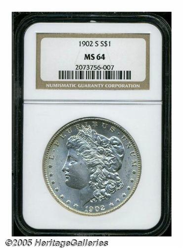 <B>1902-S<S$1> MS64 NGC.</B></I> Brilliant aside from a hint of lemon color near the rims. This lustrous and pleasantly preserved near-Gem exhibits a decent strike and exceptional eye appeal.