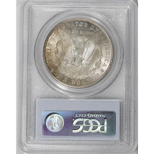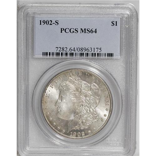 <B>1902-S<img border='0' src='http://www.heritagecoins.com/images/star.gif' width=10 height=10>$1> MS64 PCGS.</B></I> Bold designs are lightly suppressed by roller marks crossing the surfaces of both sides, quite normal for this issue. The elements were well struck and remain nicely defined. The lustrous surfaces exhibit a thin coating of lilac and golden patina that is slightly deeper on the reverse.