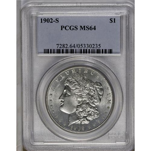 <B>1902-S<img border='0' src='http://www.heritagecoins.com/images/star.gif' width=10 height=10>$1> MS64 PCGS.</B></I> Brilliant with flashy luster and a typical strike. The fields are relatively clean and the cheek is nearly pristine, but there are a few vertical mint-made roller marks across the obverse.