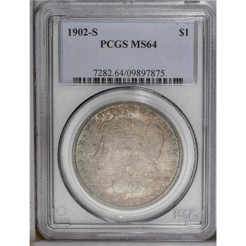 <B>1902-S<img border='0' src='http://www.heritagecoins.com/images/star.gif' width=10 height=10>$1> MS64 PCGS.</B></I> Lovely deep copper-gold and ice-blue toning graces both sides of this stunning near-Gem. Examination with a loupe reveals extensive roller marks that do not affect the technical grade, made less obvious by the deep patina. Less than fully struck, as expected, with some abrasions on the eagle's breast. <BR><BR><B>Important notice:</B> Heritage usually auctions material at the rate of 200-250 lots per hour. On some occasions eBay Live bid software or the Internet may not be able to keep up with the pace of the auction. We recommend placing a realistic absentee bid now as insurance to avoid disappointment. Occasionally the auctioneer may eliminate or reject an eBay Live bid, and the auctioneer may also reopen a lot after the close of the eBay live bidding (usually because we missed an audience bid), and may reject your bid even if it shows you as the winning bidder. By bidding via eBay Live, you agree that Heritage may award the lot to another bidder at its sole discretion under the circumstances described above or any other reasonable circumstances. Since eBay bids are not shown to us until we open the lot on the floor, we treat those bids just like floor bids. In most cases the floor responds before the eBay bid is presented to us, due to Internet lag time, so for consistency we have made it a policy that floor bids are always considered first over tie eBay live bids. Also please note that all Heritage lots purchased through eBay Live carry a 20% Buyer's Premium. Please make sure you read the Terms and Conditions before you bid. This lot is being auctioned in conjunction with a live floor auction by Heritage Galleries & Auctioneers. All final auction and invoice information will be supplied by Heritage Galleries & Auctioneers, and all other information should be considered preliminary. Lot:3777 <BR><BR><B>Winning Notification and Billing:</B> After the FINAL session in this auction is complete, Heritage will send e-mail and snail mail invoices. This process normally takes several days. All final auction and invoice information will be supplied by Heritage Galleries & Auctioneers, and all other information should be considered preliminary. <BR><BR>This auction will be conducted on a live auction floor and over the Internet through eBay Live. If you choose to place an absentee bid, please take a moment to <font color='#0000ff'><u><a href='http://pages.ebay.com/liveauctions/help/before/laabsentee.html'>learn how eBay Live absentee bidding works</a></u></font><font color='#000000'>