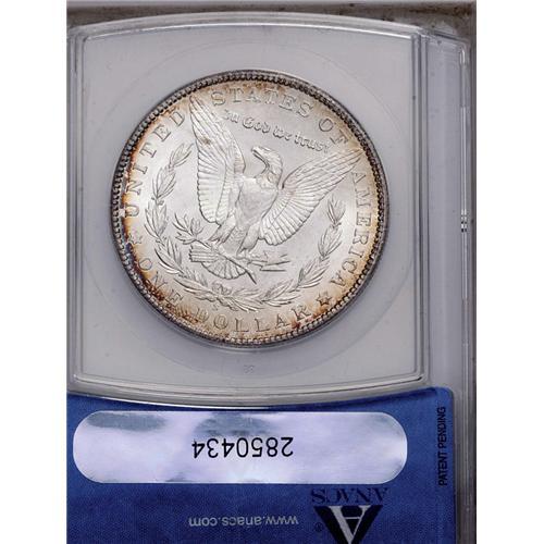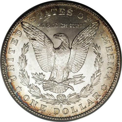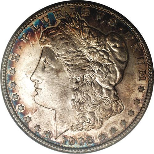 <B>1902-S<img border='0' src='http://www.heritagecoins.com/images/star.gif' width=10 height=10>$1> MS65 ANACS.</B></I> This is a lovely Gem with frosty and highly lustrous surfaces. The obverse is subdued by faint lilac and iridescent toning, and the reverse is essentially brilliant with peripheral gold color. A pleasing example with few peers.