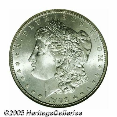 <B>1902-S<S$1> MS65 NGC.</B></I> Here is a late date Morgan Dollar that is about as rare in worn condition as it is in the finer Mint State grades. Most Uncirculated examples had entered collectors' hands by the 1950s, after which time the issue's rarity has grown in appreciation among students of the Morgan Dollar series. A solidly graded Gem, both sides are untoned with satiny luster and some intermingling of mint frost. Light striking incompleteness in the centers is typical of the date, but smooth, minimally features are definitely not. This coin would certainly satisfy the most discriminating specialist. Population: 87 in 65, 7 finer (4/05).