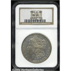 <B>1902-S<S$1> MS65 NGC.</B></I> Lustrous with a moderate overlay of smoky-golden toning and a noticeable degree of reflectivity in the fields on each side. A touch soft in the centers with a few roller marks evident. Still, a no-questions Gem example of this popular Redfield date. <BR><BR><B>Important notice:</B> Heritage usually auctions material at the rate of 200-250 lots per hour. On some occasions eBay Live bid software or the Internet may not be able to keep up with the pace of the auction. We recommend placing a realistic absentee bid now as insurance to avoid disappointment. Occasionally the auctioneer may eliminate or reject an eBay Live bid, and the auctioneer may also reopen a lot after the close of the eBay live bidding (usually because we missed an audience bid), and may reject your bid even if it shows you as the winning bidder. By bidding via eBay Live, you agree that Heritage may award the lot to another bidder at its sole discretion under the circumstances described above or any other reasonable circumstances. Since eBay bids are not shown to us until we open the lot on the floor, we treat those bids just like floor bids. In most cases the floor responds before the eBay bid is presented to us, due to Internet lag time, so for consistency we have made it a policy that floor bids are always considered first over tie eBay live bids. Also please note that all Heritage lots purchased through eBay Live carry a 20% Buyer's Premium. Please make sure you read the Terms and Conditions before you bid.