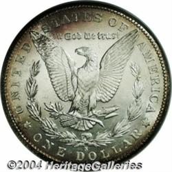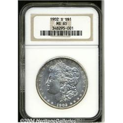 <B>1902-S<S$1> MS65 NGC.</B></I> Freckles of orange patina hug the borders of this lustrous and well preserved Gem. Not fully struck, but the definition is more than suitable for this challenging issue. As is the case with the other San Francisco Mint Dollars of this era, the 1902-S is rarely seen as a Gem. <BR><BR><B>Important notice:</B> Heritage usually auctions material at the rate of 200-250 lots per hour. On some occasions eBay Live bid software or the Internet may not be able to keep up with the pace of the auction. We recommend placing a realistic absentee bid now as insurance to avoid disappointment. Occasionally the auctioneer may eliminate or reject an eBay Live bid, and the auctioneer may also reopen a lot after the close of the eBay live bidding (usually because we missed an audience bid), and may reject your bid even if it shows you as the winning bidder. By bidding via eBay Live, you agree that Heritage may award the lot to another bidder at its sole discretion under the circumstances described above or any other reasonable circumstances. Since eBay bids are not shown to us until we open the lot on the floor, we treat those bids just like floor bids. In most cases the floor responds before the eBay bid is presented to us, due to Internet lag time, so for consistency we have made it a policy that floor bids are always considered first over tie eBay live bids. Also please note that all Heritage lots purchased through eBay Live carry a 20% Buyer's Premium. Please make sure you read the Terms and Conditions before you bid. </span></font></tr></table></td></tr></table>