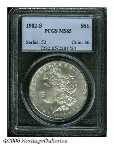 <B>1902-S<S$1> MS65 PCGS.</B></I> Extremely lustrous with strong central details for this often substandard issue. As is often seen on the '02-S, but far less obvious on this piece, wispy roller marks can be detected across Liberty's cheek and ear. We mention this only for accuracy, as it does not adversely affect the coin's strike or eye appeal.
