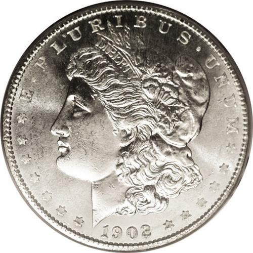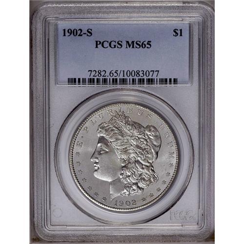 <B>1902-S<img border='0' src='http://www.heritagecoins.com/images/star.gif' width=10 height=10>$1> MS65 PCGS.</B></I> This is a gorgeous Gem with fully brilliant satin luster and relatively sharp design features, although the hair curls over Liberty's ear are somewhat ill-defined. Faint vertical planchet striations can be seen at the center of the obverse.