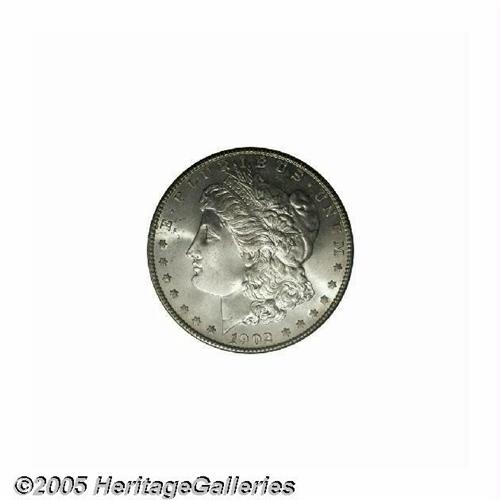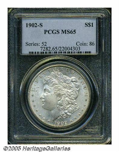 <B>1902-S<S$1> MS65 PCGS.</B></I> While the 1902-S is always available for a price up to and including MS64 condition, Gems are very elusive. This lovely Gem has unusually clean surfaces on each side, and the sparkling mint brilliance is only interrupted by the presence of a thin coating of pastel-golden patina over each side. Population: 176 in 65, 25 finer (6/05).