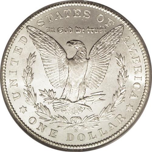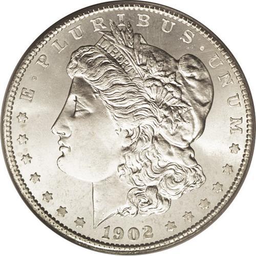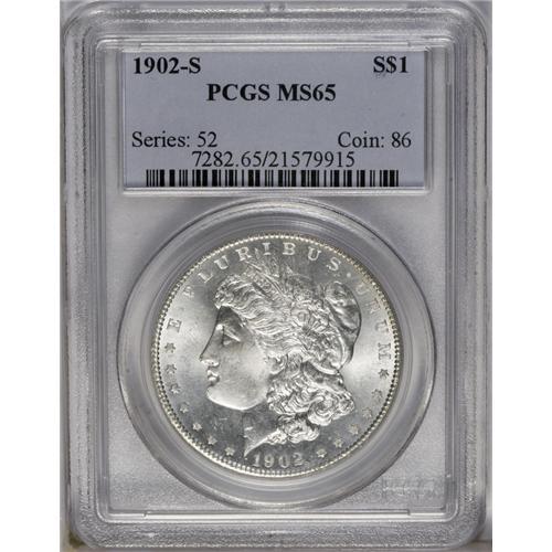 <B>1902-S<img border='0' src='http://www.heritagecoins.com/images/star.gif' width=10 height=10>$1> MS65 PCGS.</B></I> With an original mintage of just 1.5 million pieces, it is little wonder that the 1902-S is equally elusive in circulated and Mint State grades. This untoned Gem is bursting with satiny luster that accents the smooth, nearly pristine surfaces. The strike is bold in most areas, but the central reverse is a trifle soft. An attractive coin with no mentionable abrasions on Liberty's cheek.<BR><I>From The Chicago-Ark Collection.</B></I>