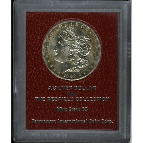 <B>1902-S<img border='0' src='http://www.heritagecoins.com/images/star.gif' width=10 height=10>$1> Morgan Dollar MS65 Paramount International (MS63).</B></I> Ex: Redfield. Sea-green and chestnut gold invigorate the borders of this lustrous and attractive scarcer date dollar. Light grazes on the cheek decline a finer grade.