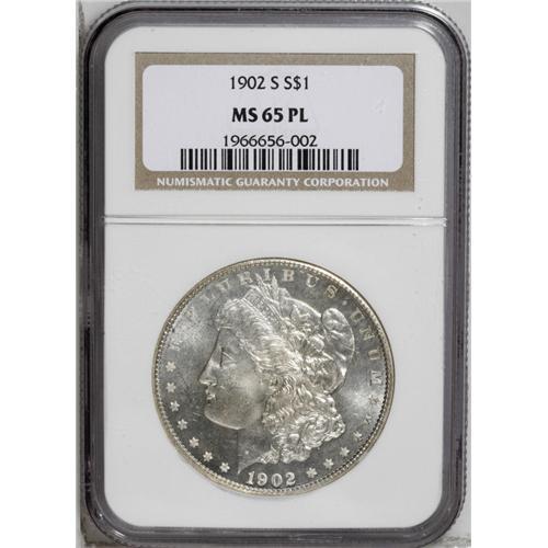 <B>1902-S<img border='0' src='http://www.heritagecoins.com/images/star.gif' width=10 height=10>$1> MS65 Prooflike NGC.</B></I> Gems of this issue are infrequently encountered, and DMPL coins almost never found. When DMPL coins are found, they are invariably in lower Mint State grades. This pleasing example features untoned surfaces that are profoundly mirrored. The fields are also free of distractions, save for a couple of tiny abrasions in remote corners of the reverse. Liberty's cheek is especially clean and pleasing. Some faint roller marks can be perceived under a glass, due to the somewhat soft strike through the centers. <I>This example, and a second at PCGS, are tied for the finest Prooflikes known of this issue. The highest graded DMPL examples are a single MS62 coin at each service (8/06).</B></I>