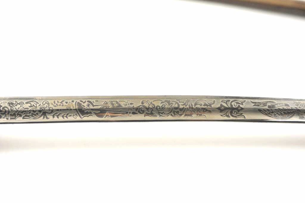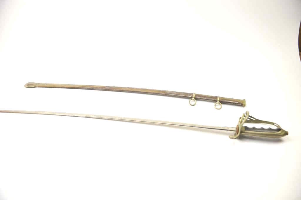 1902 U.S. Officer’s sword with scabbard marked “Henderson Ames Kalamazoo, Mich.” With excellent etched blade. Good to very good overall. Primary U.S. Officer’s sword carried from Spanish American War to WWII. Est.:$150-$300