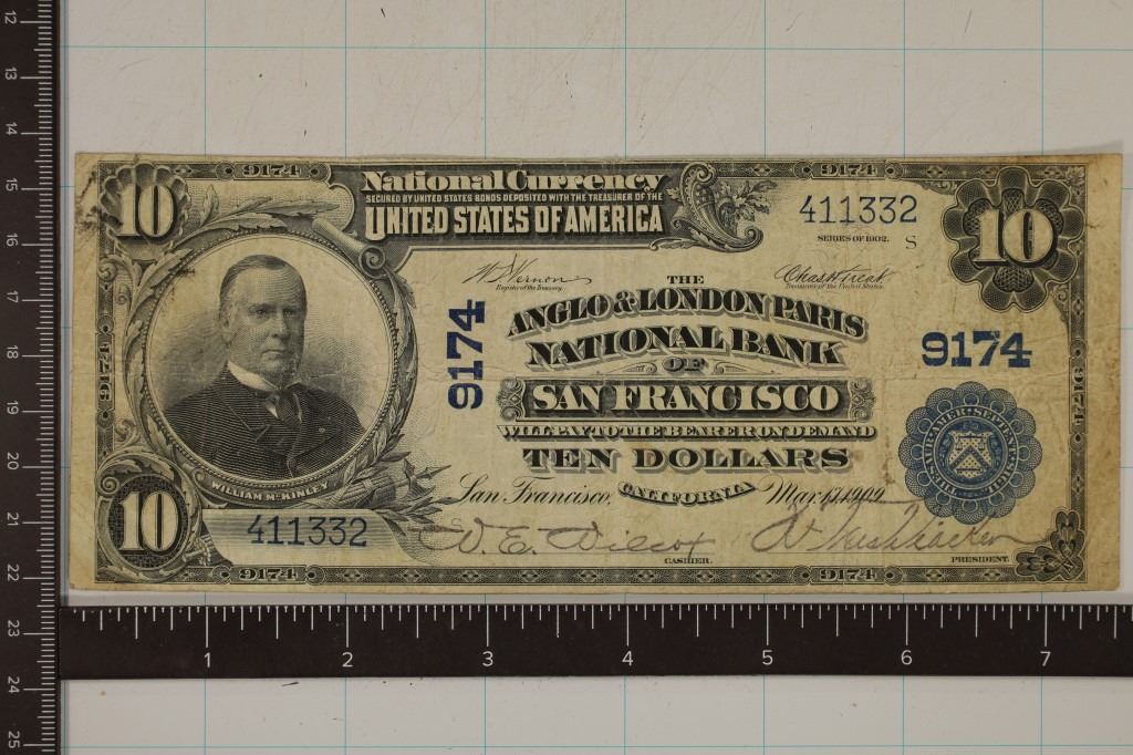 PARIS NATIONAL BANK OF SAN FRANCISCO, HAND SIGNED, LARGE SIZE, BLUE SEAL. ONE SMALL SMALL SMALL TEAR HOLE RIGHT SIDE ON THE BLUE NUMBER 7, OTHER WISE A VERY NICE BILL OF AVERAGE CIRCULATION