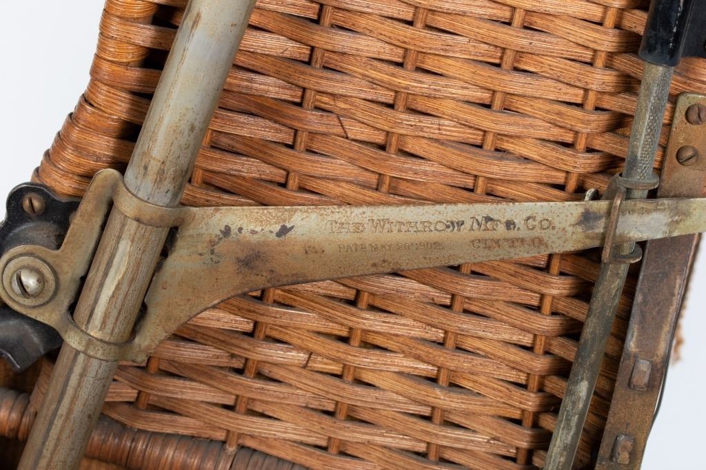 Item/Description: Oriole Go-Basket wheeled perambulator / baby stroller. Marked on side bars: "The Withrow Mfg. Co / Pat. May 20, 1902 / CIN,TI, O." Metal plaque attached: Withrow Manufacturing Co. in Cincinnati, Ohio "Oriole".