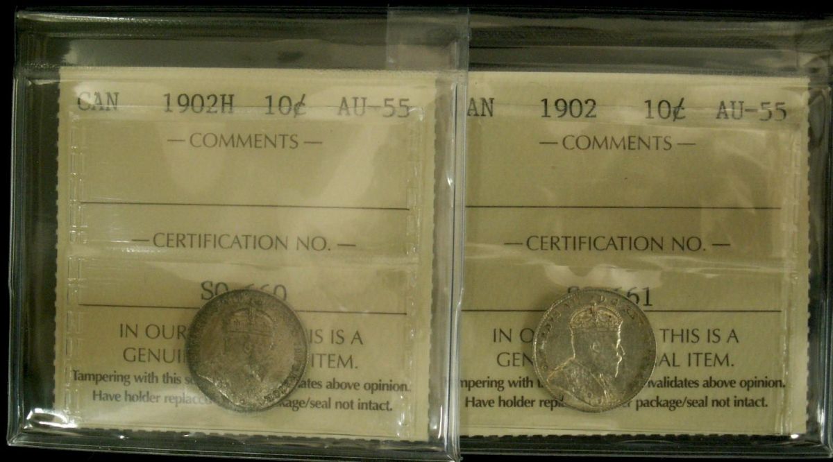 1902 and 1902H 10¢, both ICCS graded AU-55
