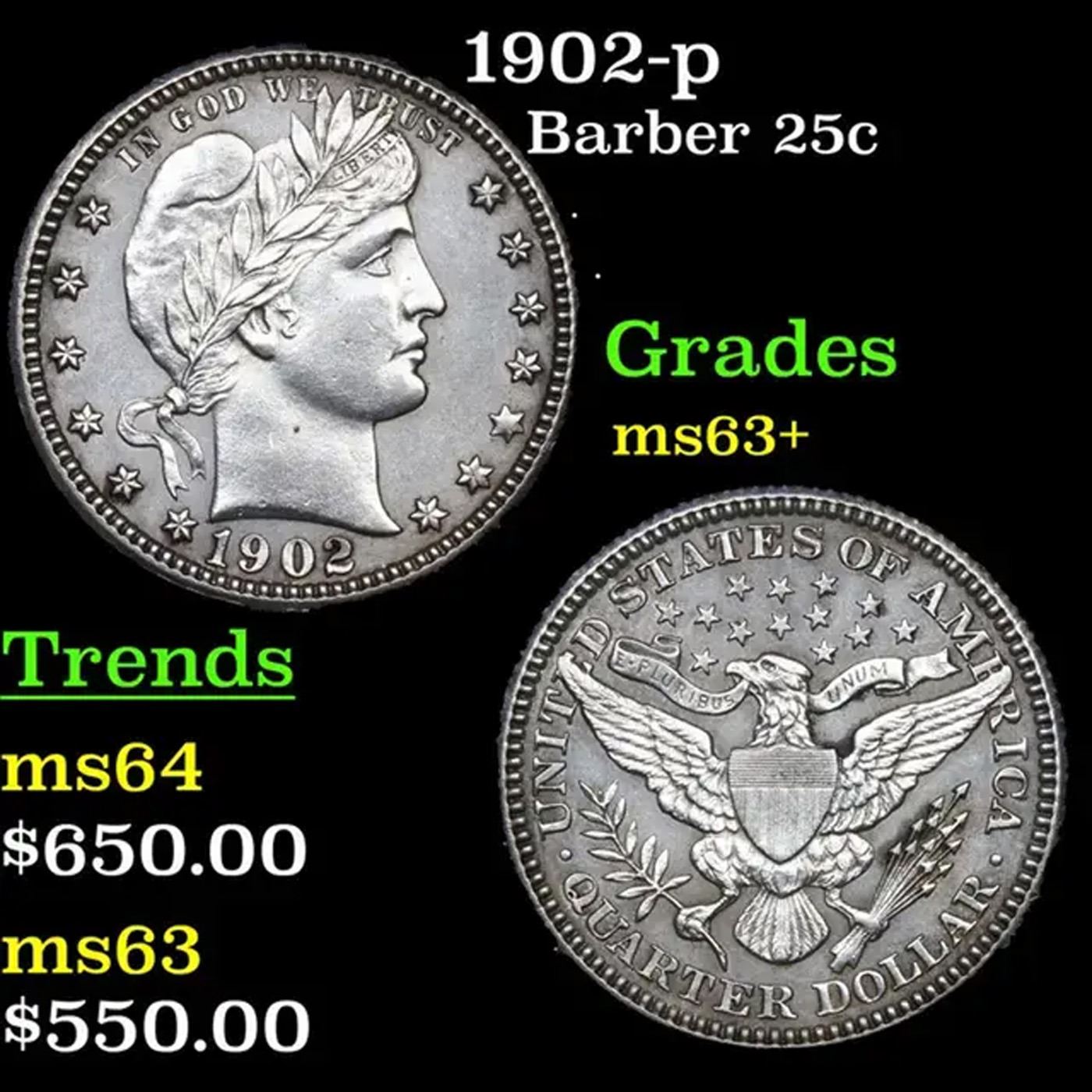 1902-p Barber Quarter 25c Graded ms63+ By SEGS. A Key Date's Pick, Bid to Win, Don't let it get Away Coin