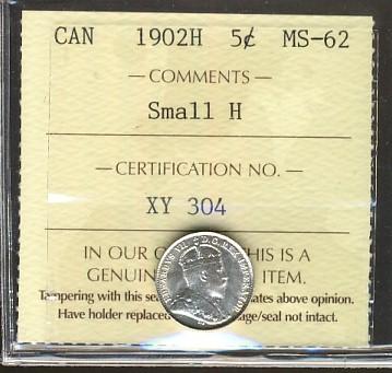 1902 small H 5¢ ICCS MS62, brilliant