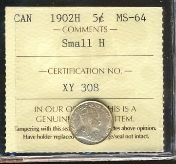 1902 small H 5¢ ICCS MS64, nicely toned.