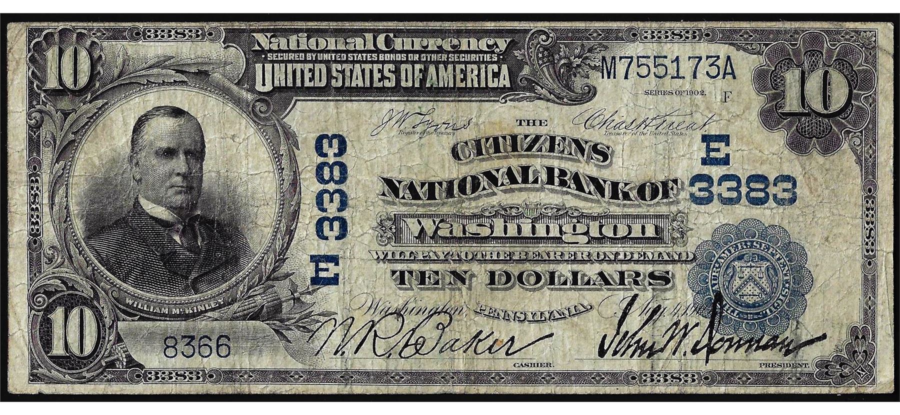One 1902DB $10 Citizens NB of Washington, PA CH# 3383 National Currency Note.