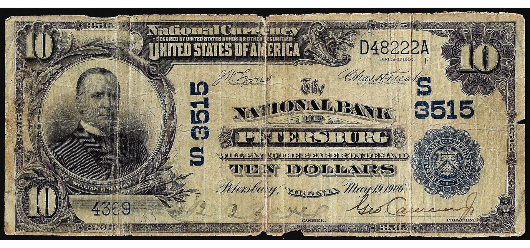 One 1902DB $10 National Bank of Petersburg, Virginia CH#3515 National Currency Note.