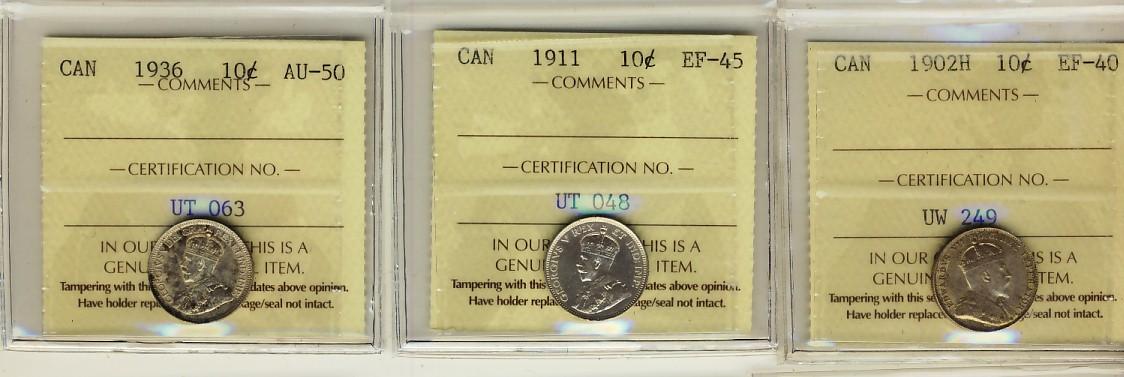 1902H 10¢, 1911 & 1936 ICCS MSEF40. Lot of 3 coins.