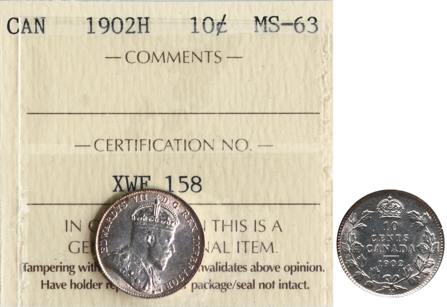 1902H 10¢ ICCS Choice Mint State-63 Fully brilliant and lustrous with golden tone around the rims.