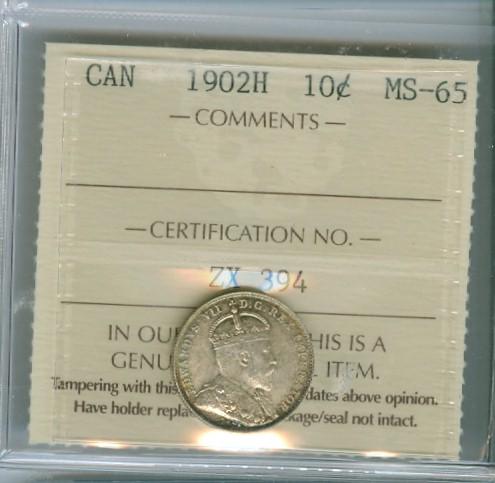 1902H 10¢ ICCS MS-65 PQ+. Light autumn shades over full underlying luster. Wow! An amazing "Edwardian" example. Excellent strike with clean fields and great surfaces.