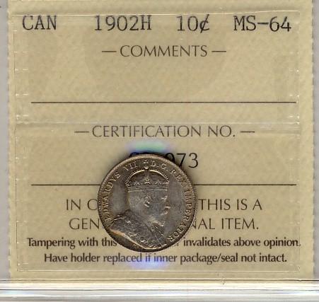 1902H 10¢ ICCS MS64. Great mintstate issue with lots of lustre and golden tone.