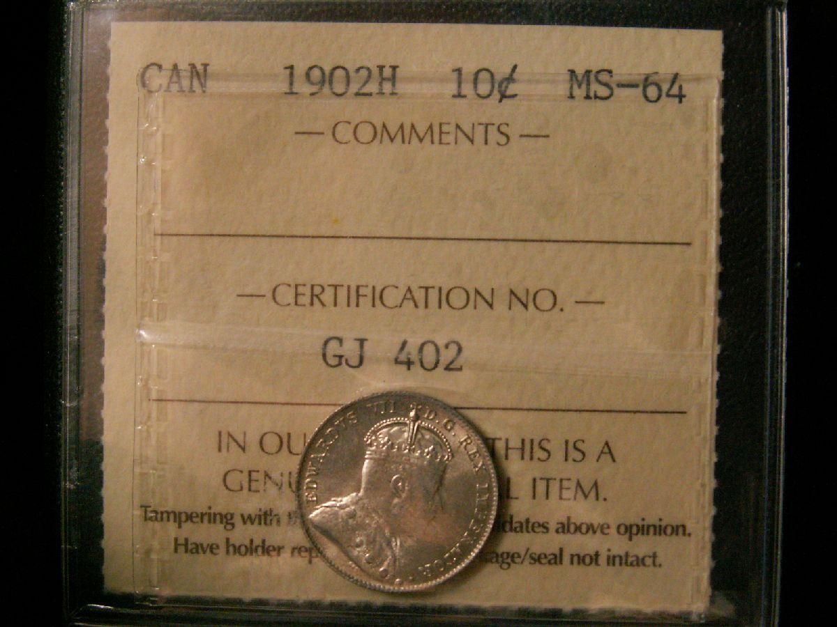 1902H 10¢ ICCS MS64. Lustrous with hint of golden shades.