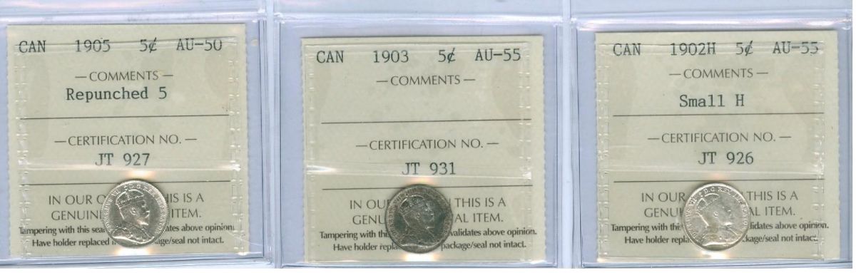 1902H, 1903 & 1905 5¢. Lot of 3 ICCS graded coins, 1902H AU55, 1903 AU55 and 1905 re-punched 5 AU50