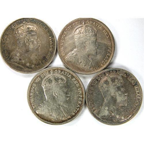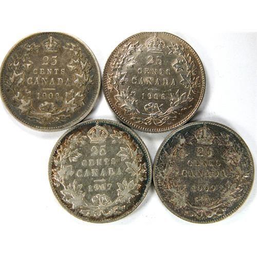 Canada Twenty-Five Cents 1902H, 1906 Large Crown, 1907 and 1909, all VF and pale to light-medium toned
