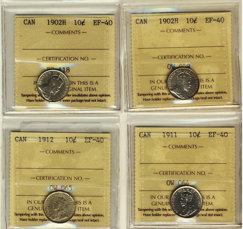 1902H(2) 10¢, 1911 & 1912 ICCS EF40. Lot of 4 coins.