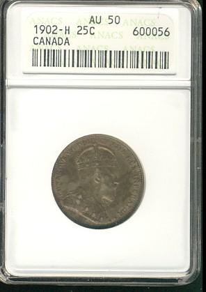 1902H 25¢ ANACS AU50. Toned example eith EF details.
