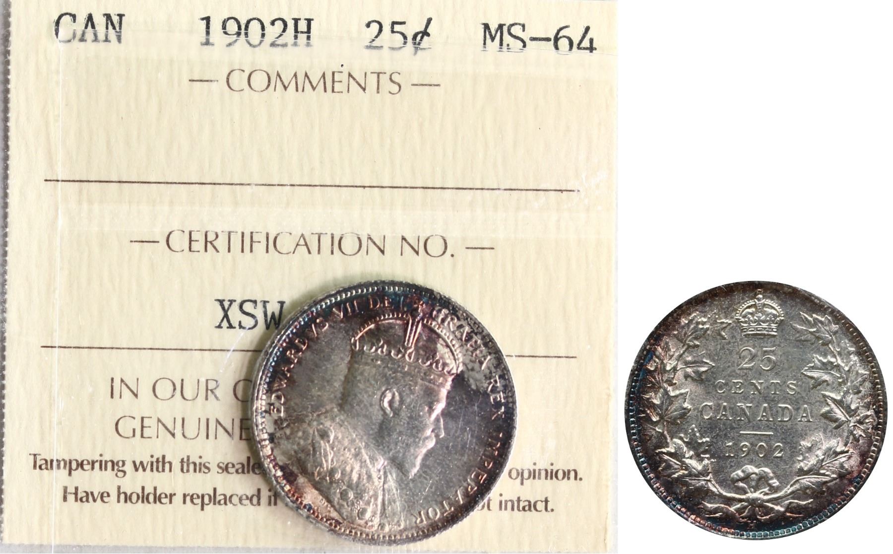 1902H 25¢ ICCS Very Choice Mint State-64, Fully brilliant with autumn shades around the rims.