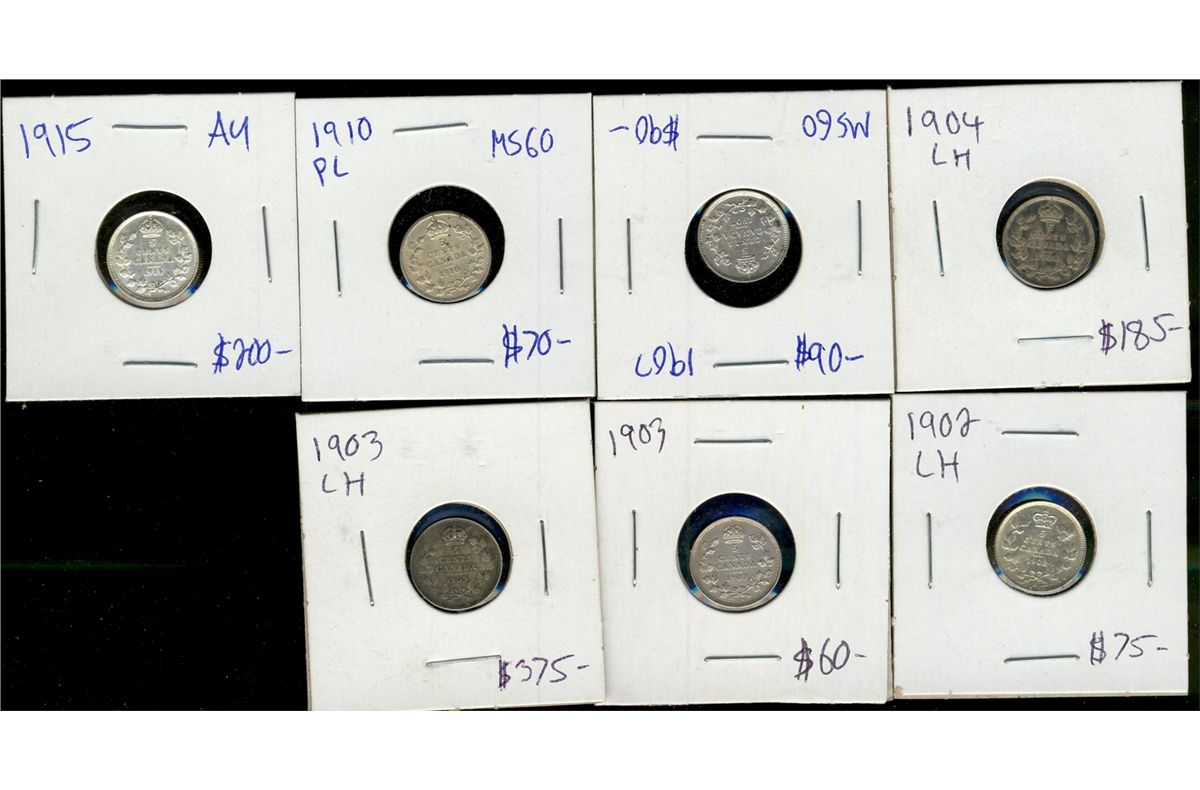 1902H 5¢, 1903, 1903H, 1914, 1907, 1910PL & 1915. Lot of 7 coins VF and better.