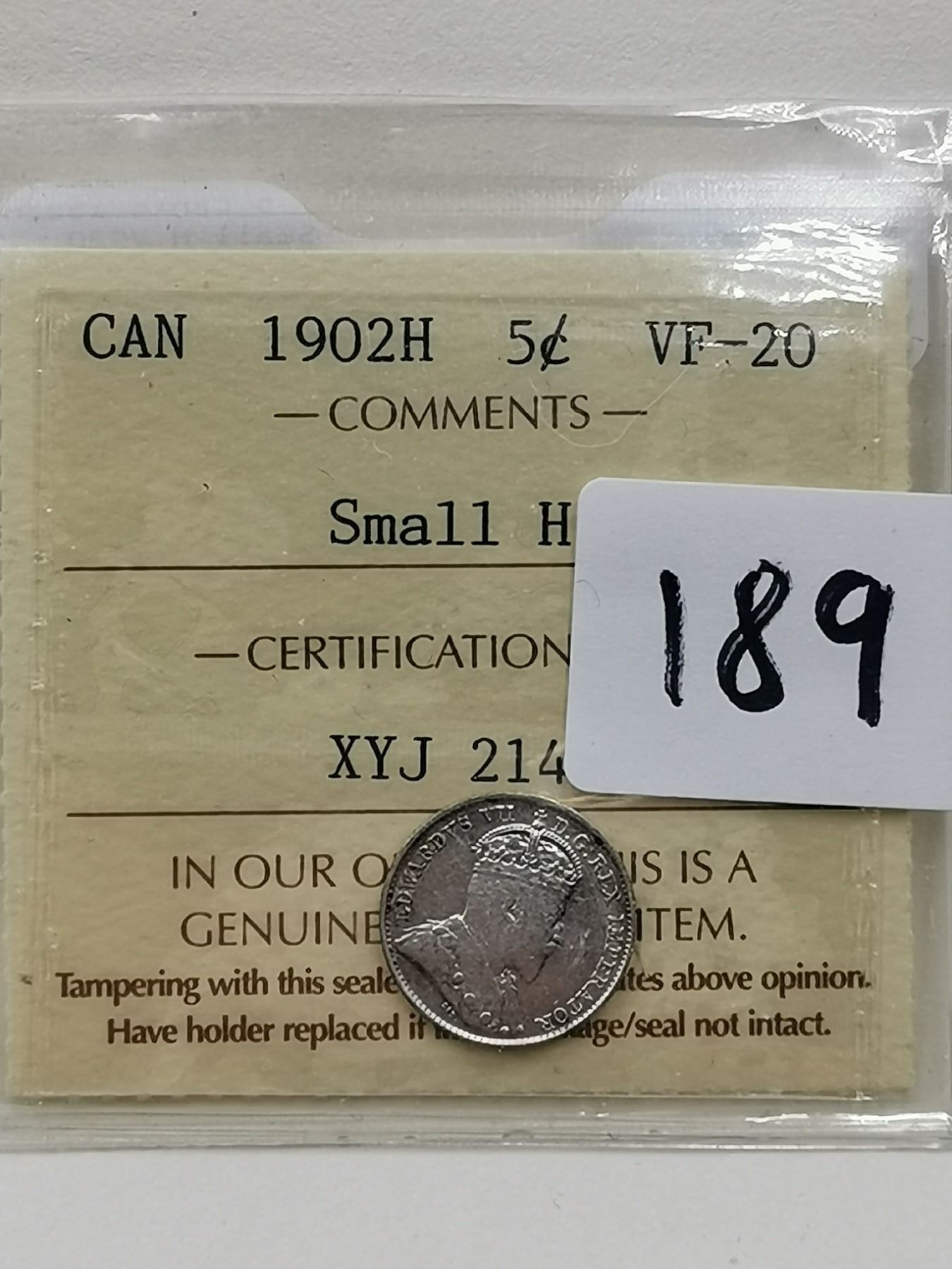 1902H 5 Cent, Small H, VF20 CERTIFY