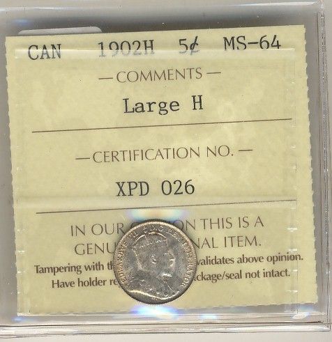 1902H 5¢ Lg H ICCS MS64. Nice golden shades.