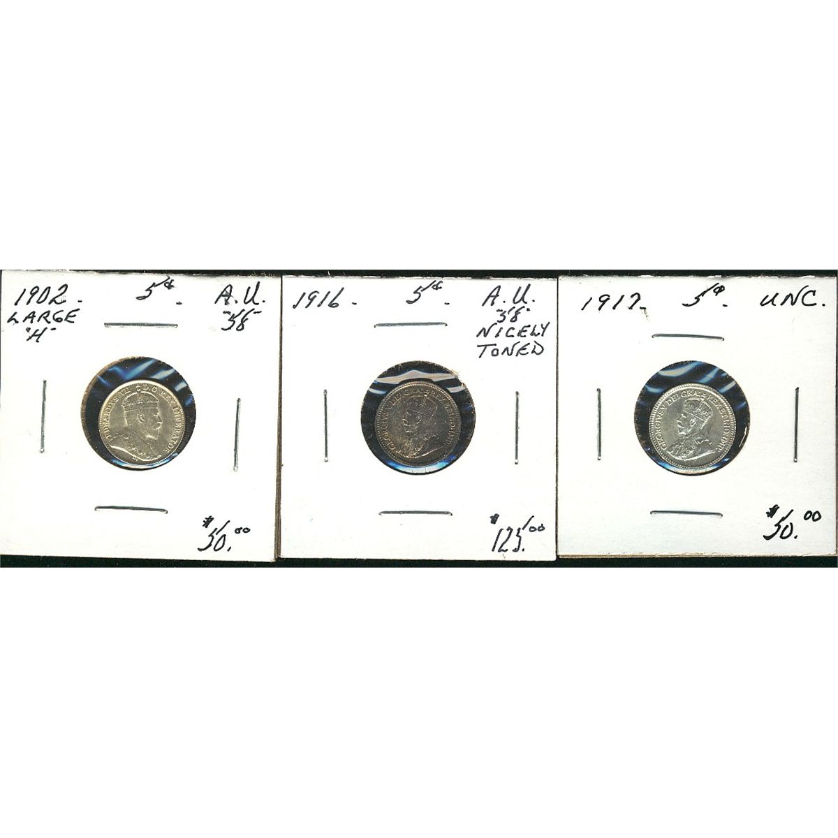 1902H Lg 5¢, 1916 & 1917 AU58 to UNC. Lot of 3 coins. (PBA).