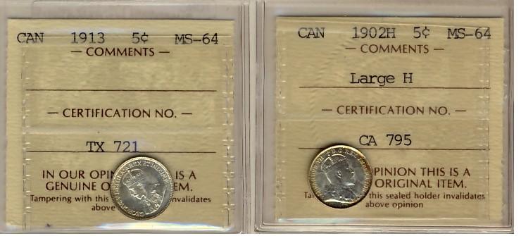 1902H Lg H & 1913 5¢ ICCS MS63. Lot of 2 coins. All in old holders.