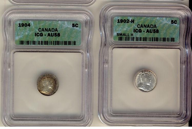 1902H Sml & 1904 5¢ ICG AU58. Lot of 2 coinsw.