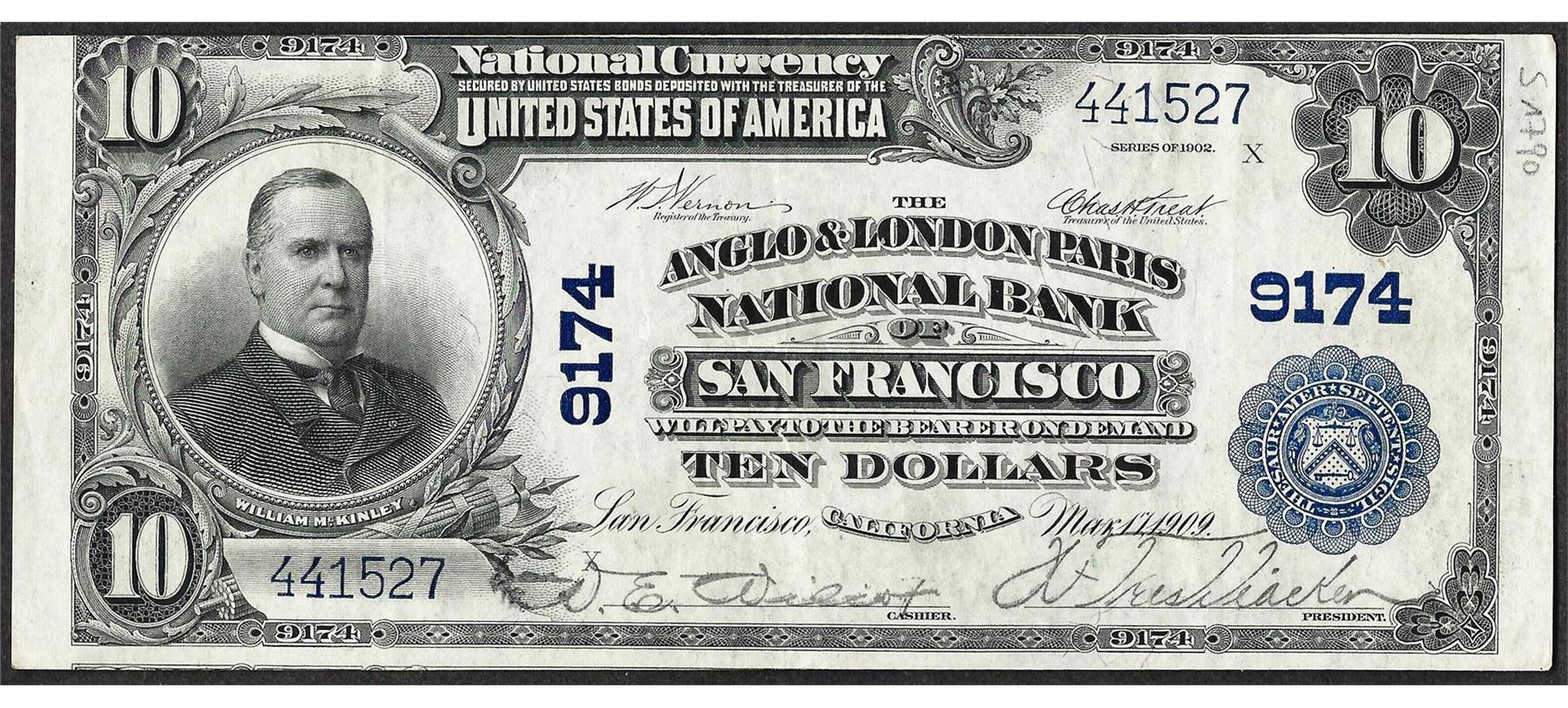 One 1902PB $10 Anglo & London Paris NB San Francisco, CA CH# 9174 National Currency note.