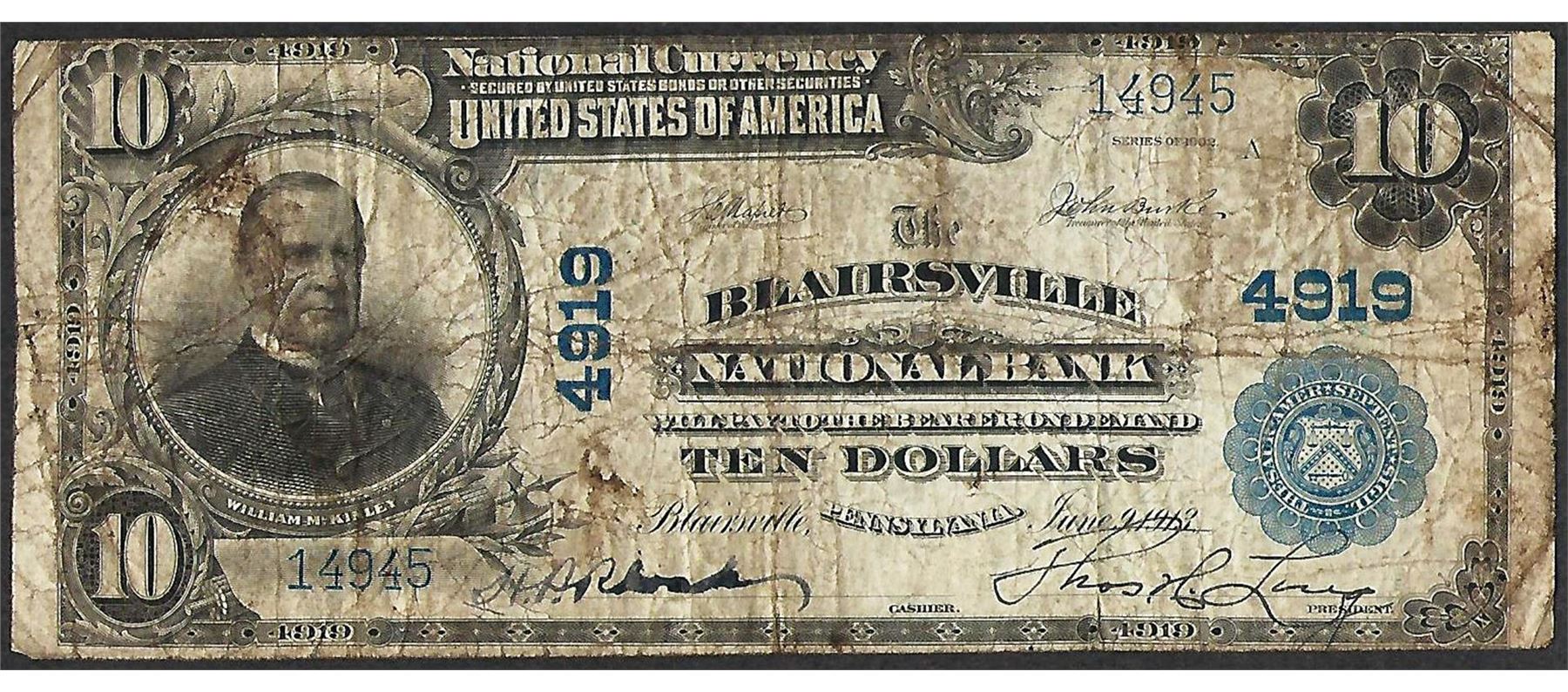 One 1902PB $10 Blairsville National Bank, PA CH# 4919 National Currency Note.