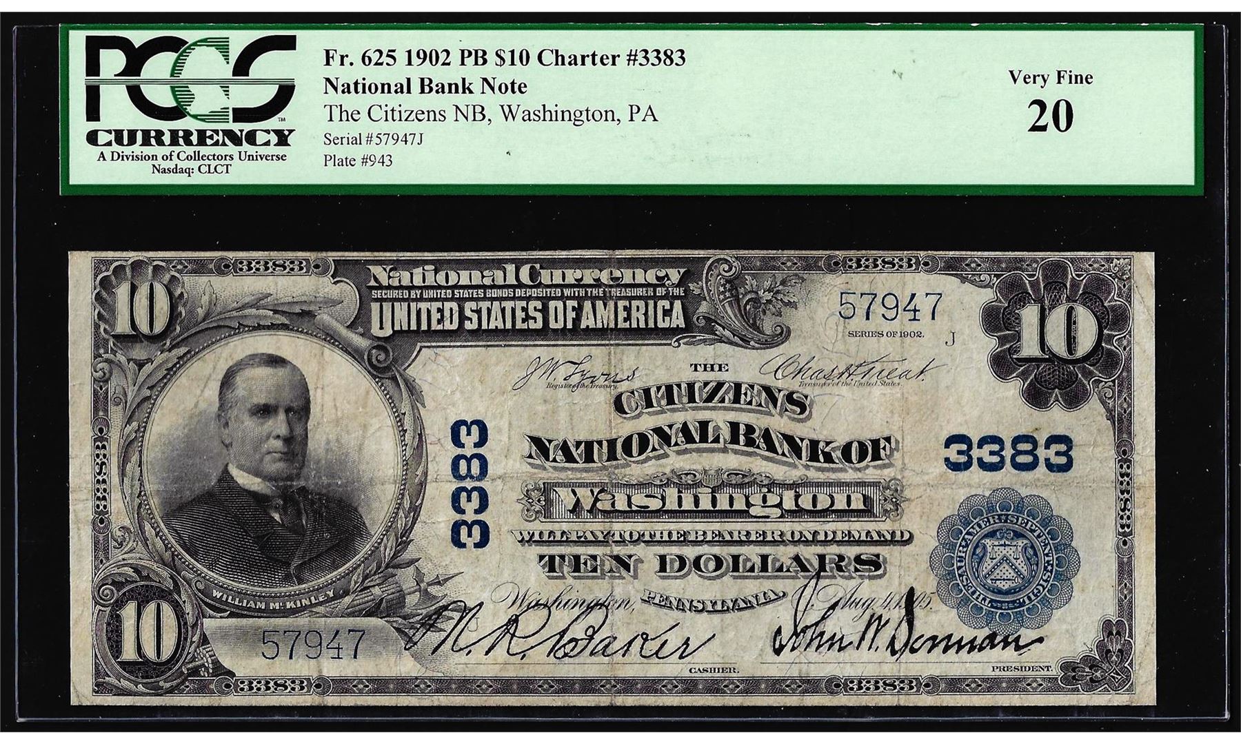 One 1902PB $10 Citizens of NB of Washington, PA CH# 3383 National Currency Note PCGS VF20. PCGS Graded.