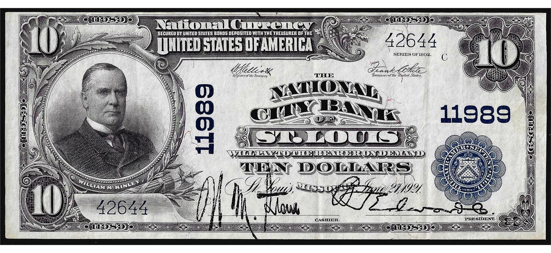 One 1902PB $10 City Bank of St. Louis, MO CH# 11989 National Currency Note.