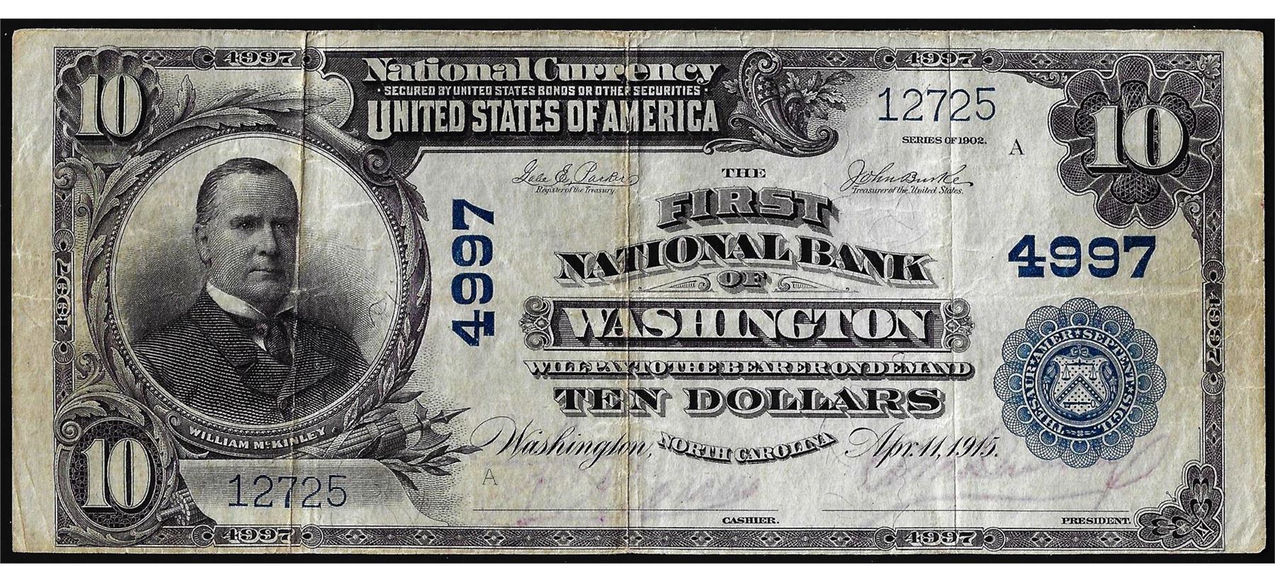 1902PB $10 First NB of Washington, North Carolina CH# 4997 National Currency Note