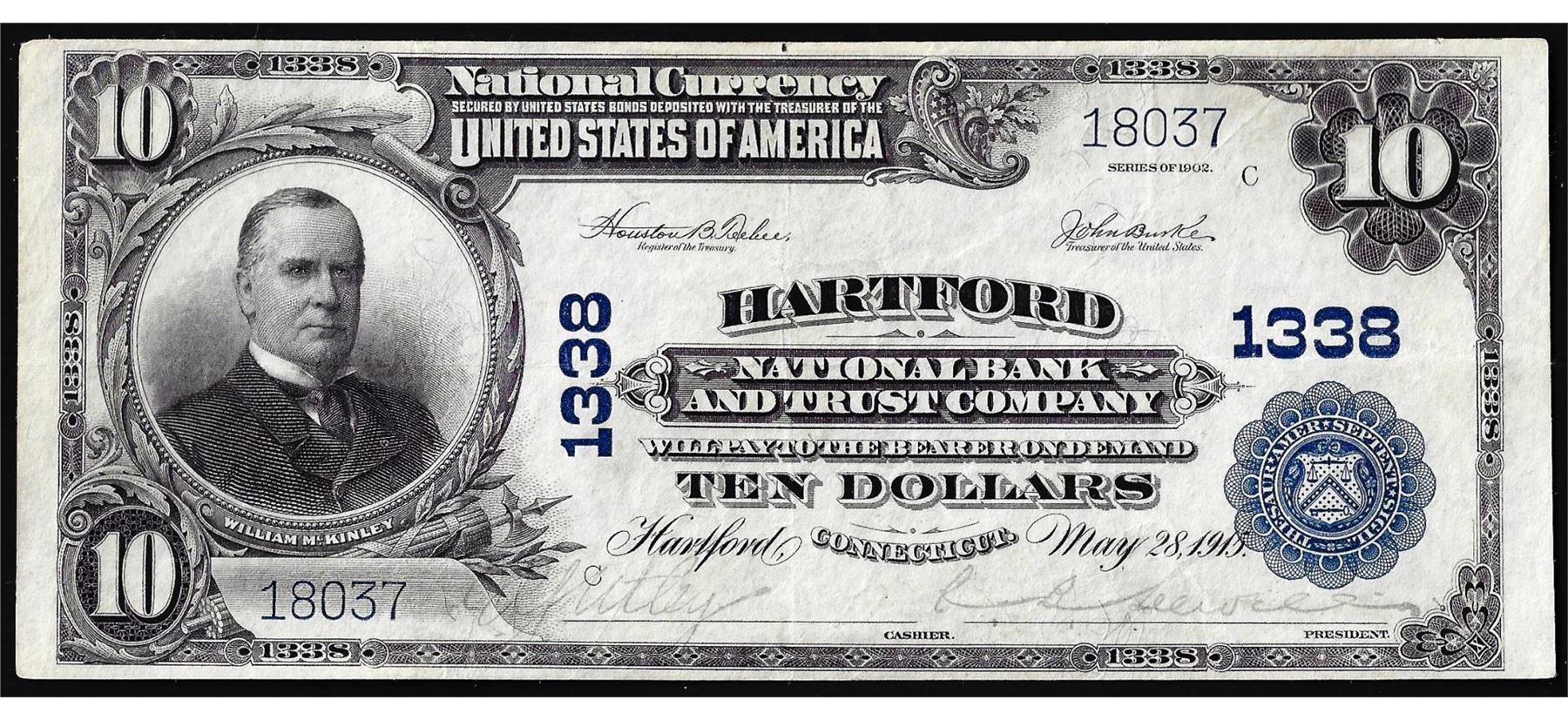 One 1902PB $10 National Bank and Trust Co. Hartford, CT CH# 1338 National Currency Note.