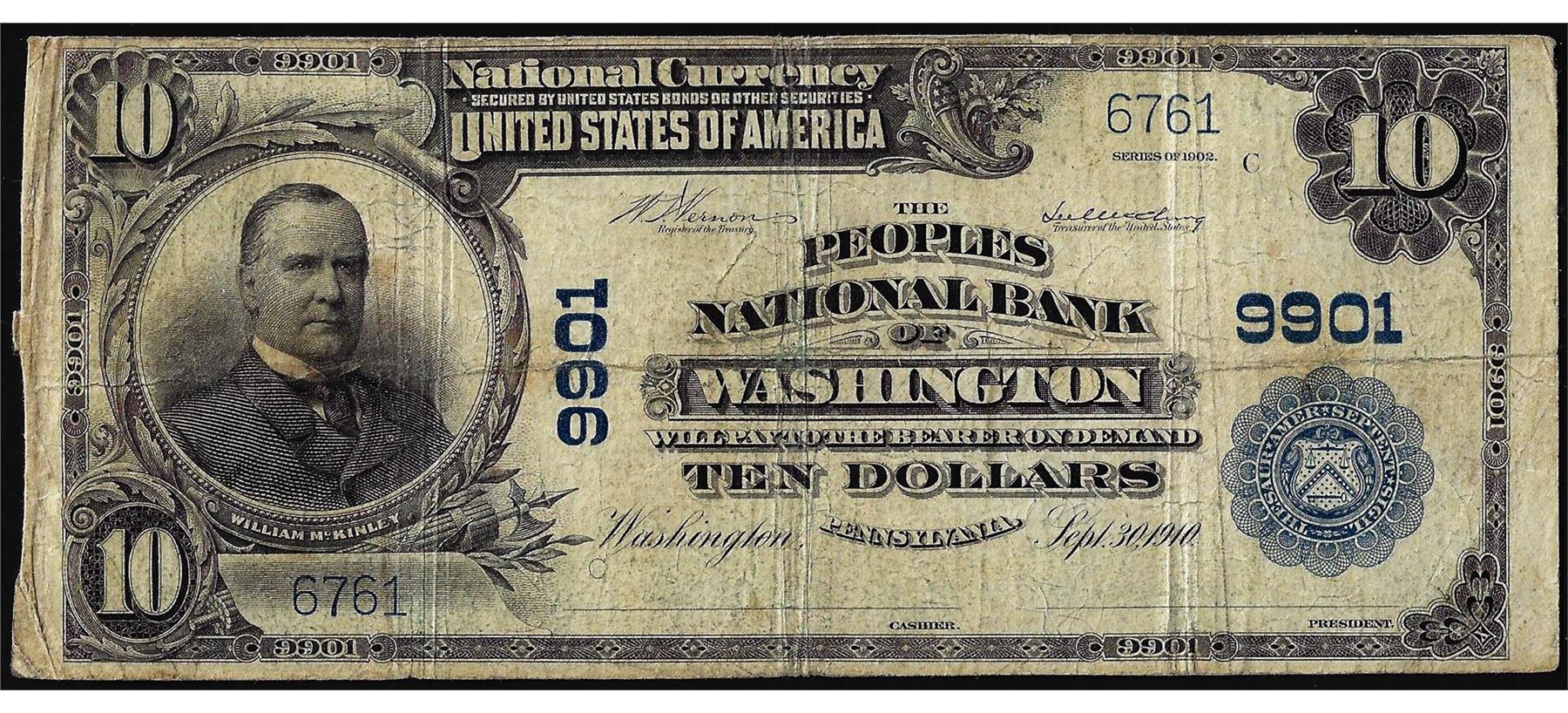One 1902PB $10 Peoples NB of Washington, PA CH# 9901 National Currency Note.