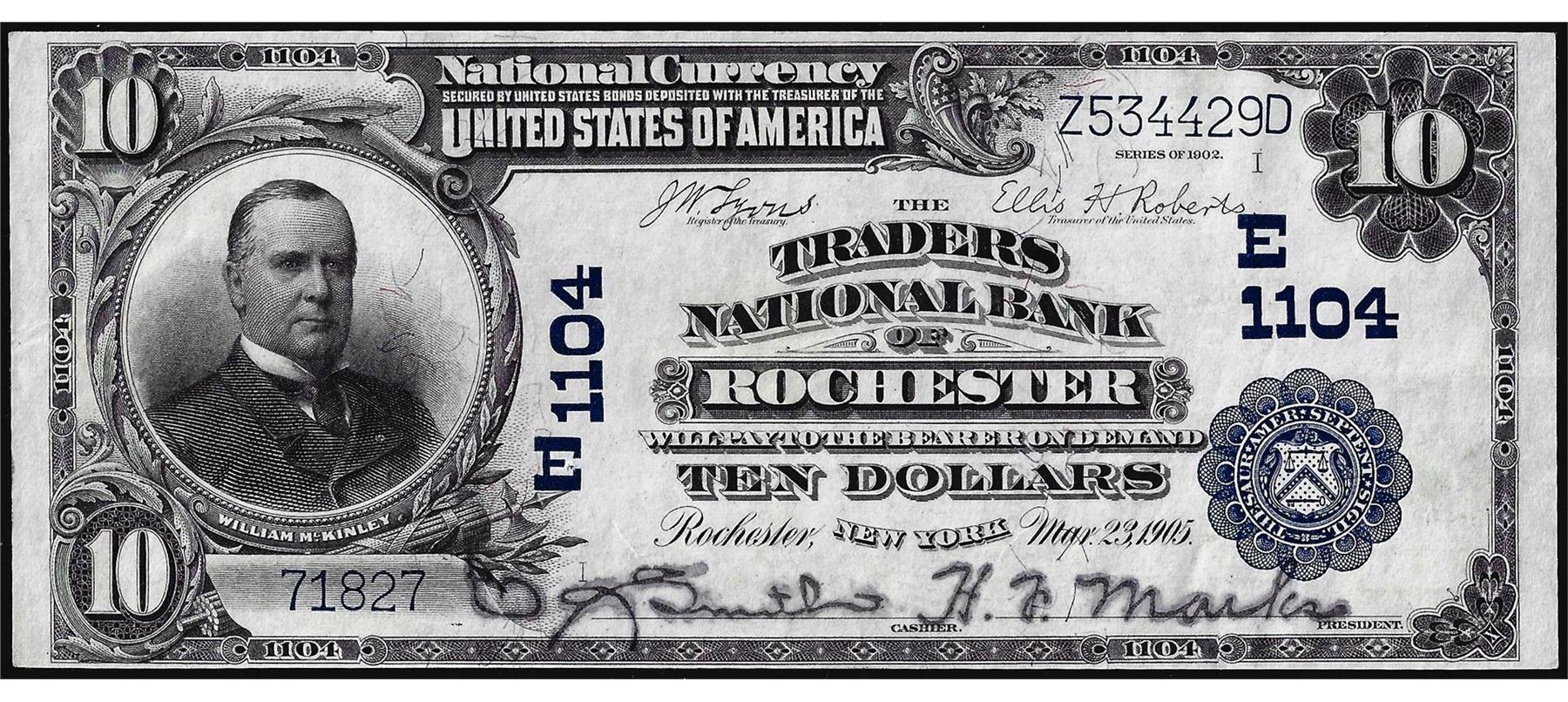 One 1902PB $10 Traders National Bank of Rochester, NY CH# 1104 National Currency Note.